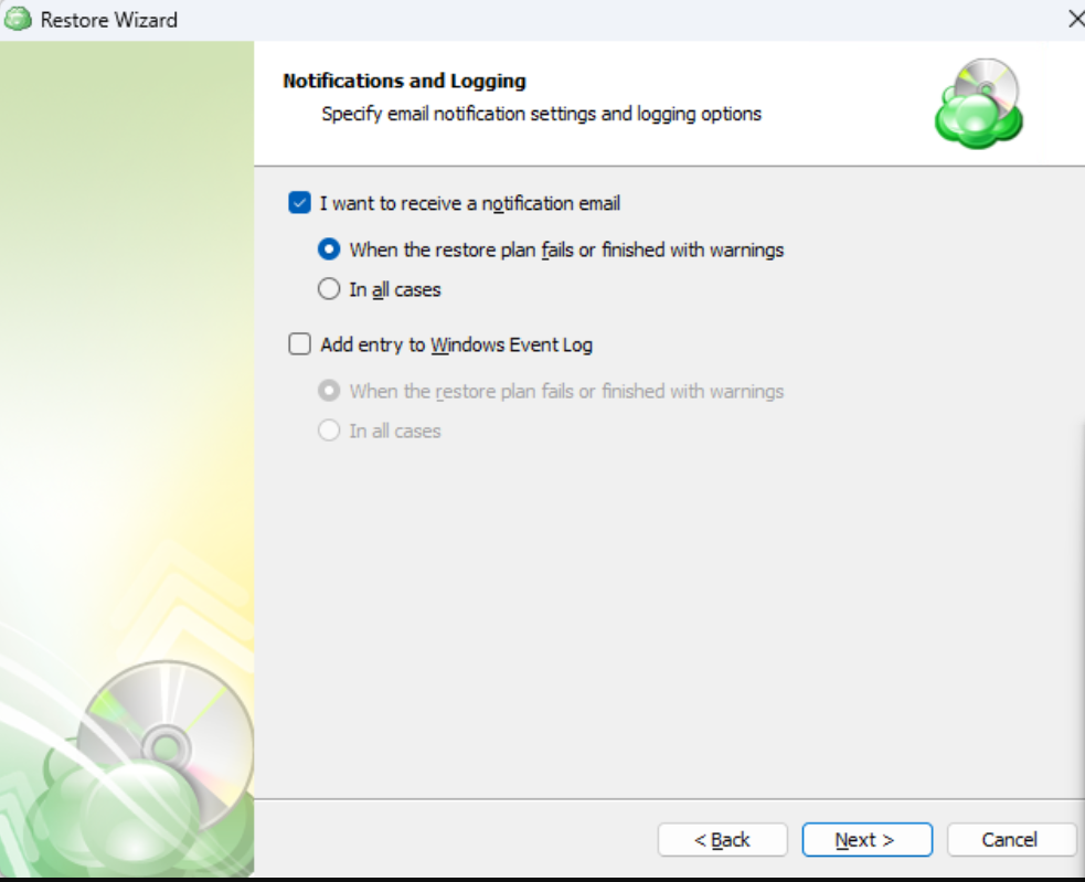 La opción Run missed scheduled restore immediately when computer starts up permite ejecutar el plan al iniciar el equipo si no pudo ejecutarse a tiempo.