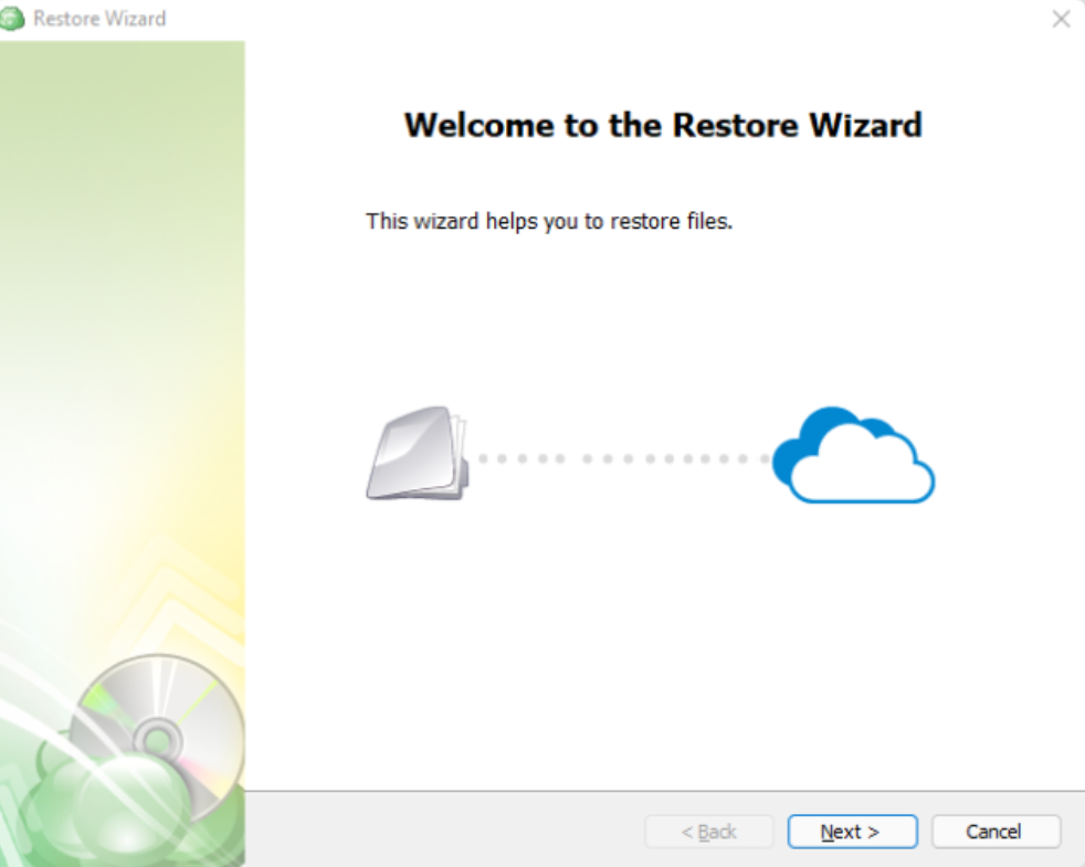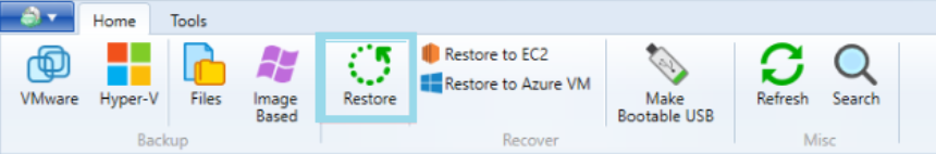 Después de iniciar Online Backup, puedes ejecutar el asistente de restauración haciendo clic en Restore en la pestaña Home del menú horizontal.