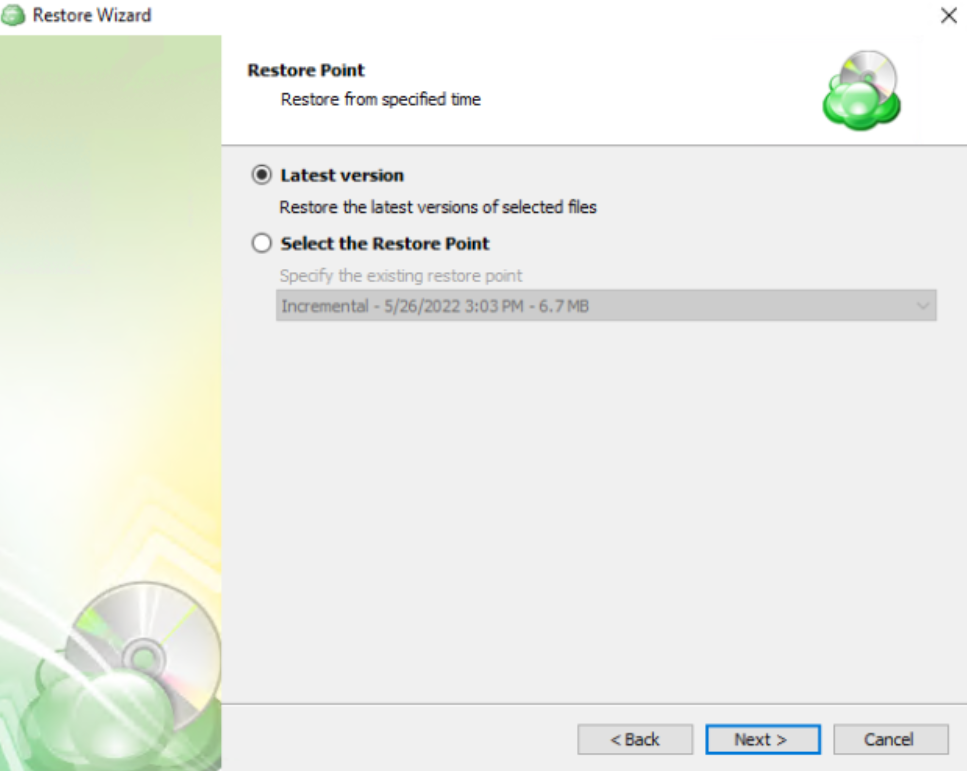 Latest Version: Restaura automáticamente la versión más reciente de cada archivo independientemente del punto de restauración al que pertenezca.