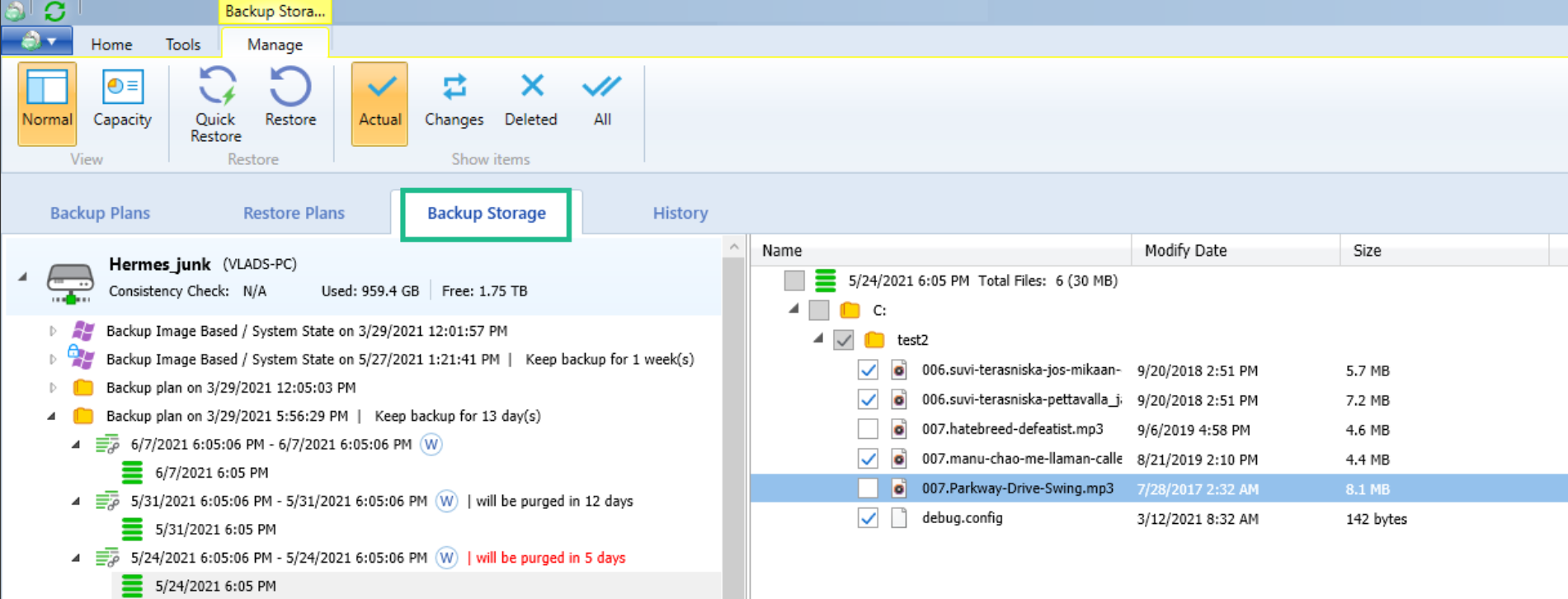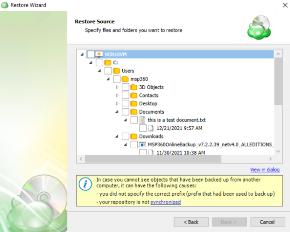 Podrás expandir la fuente de restauración y navegar por los archivos y carpetas disponibles. Si en el paso anterior seleccionaste “Manually”, también podrás expandir cada archivo individual para elegir qué versión restaurar.