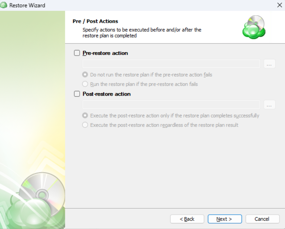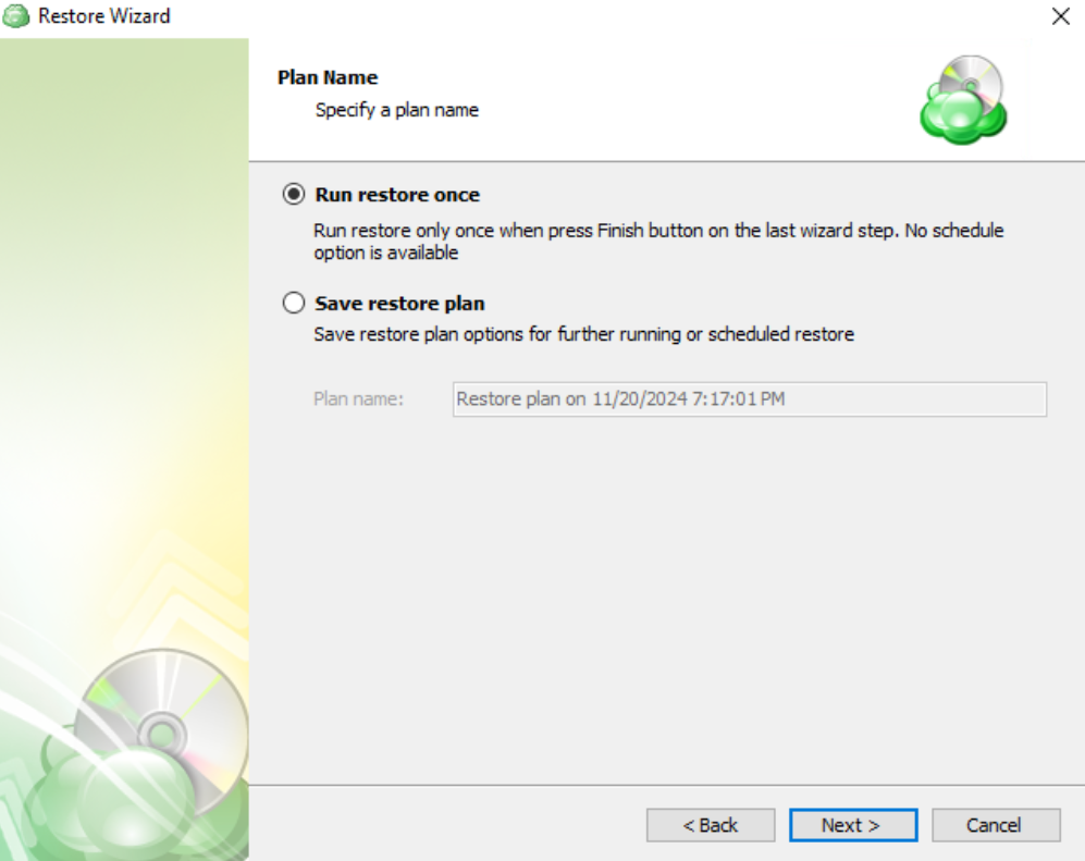 Save restore plan te permitirá programar la ejecución del plan más adelante e incluso configurarlo para restauraciones repetitivas si es necesario.