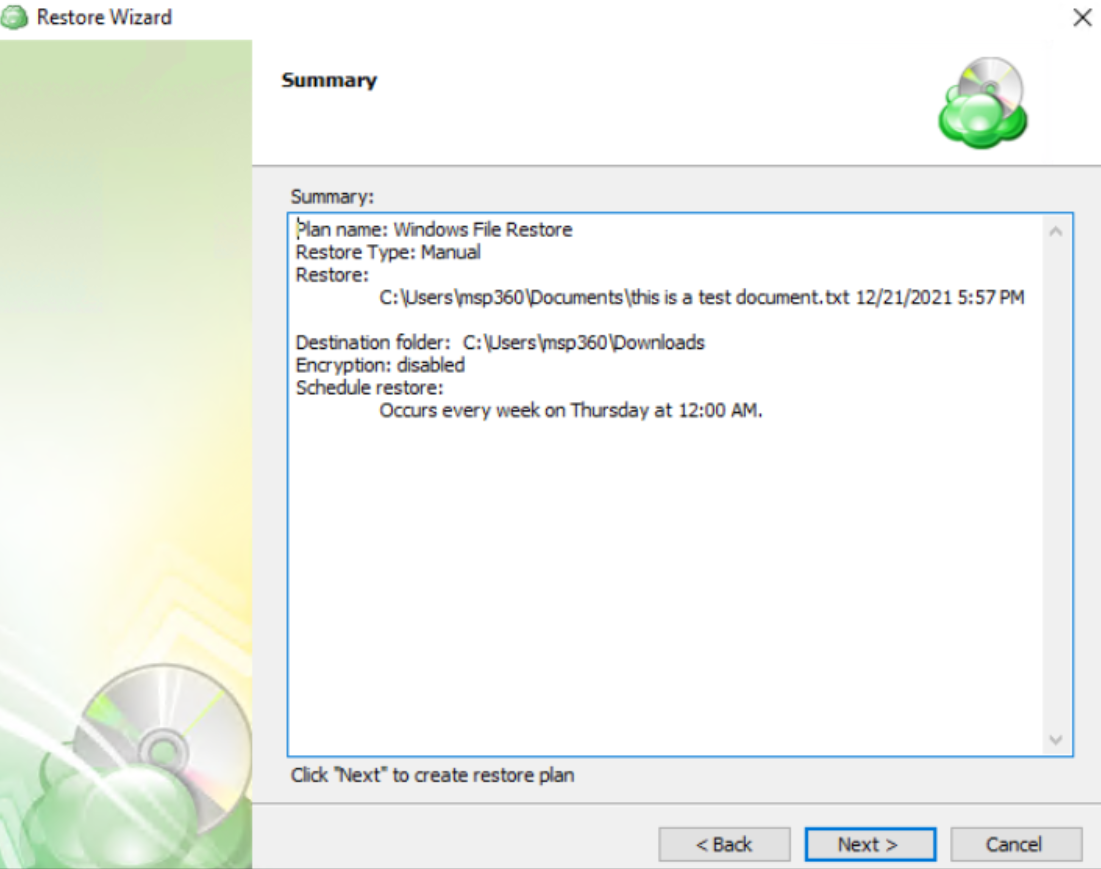 Para usar el plan regularmente, marca Save restore plan. Haz clic en Next.