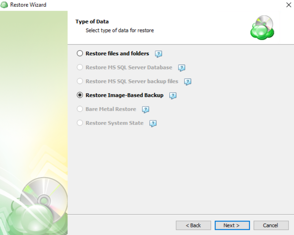 A continuación, se te presentará una lista de tipos de backups disponibles para el host seleccionado. Selecciona Restore files and folders para continuar.