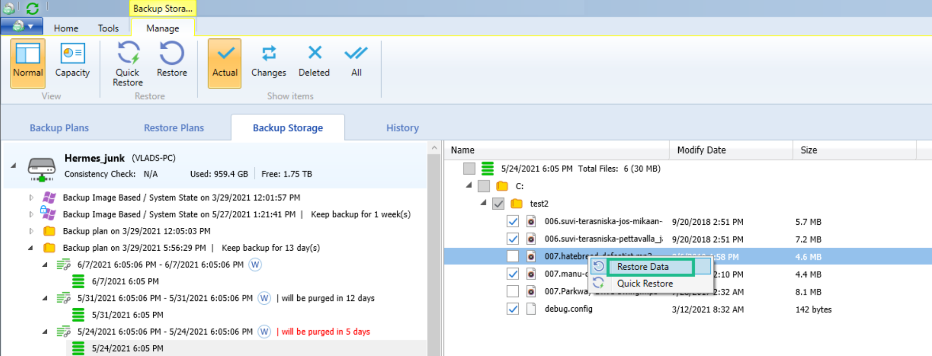 En el panel derecho, haz clic derecho sobre el elemento y selecciona Restore Data. Se inicia el asistente.