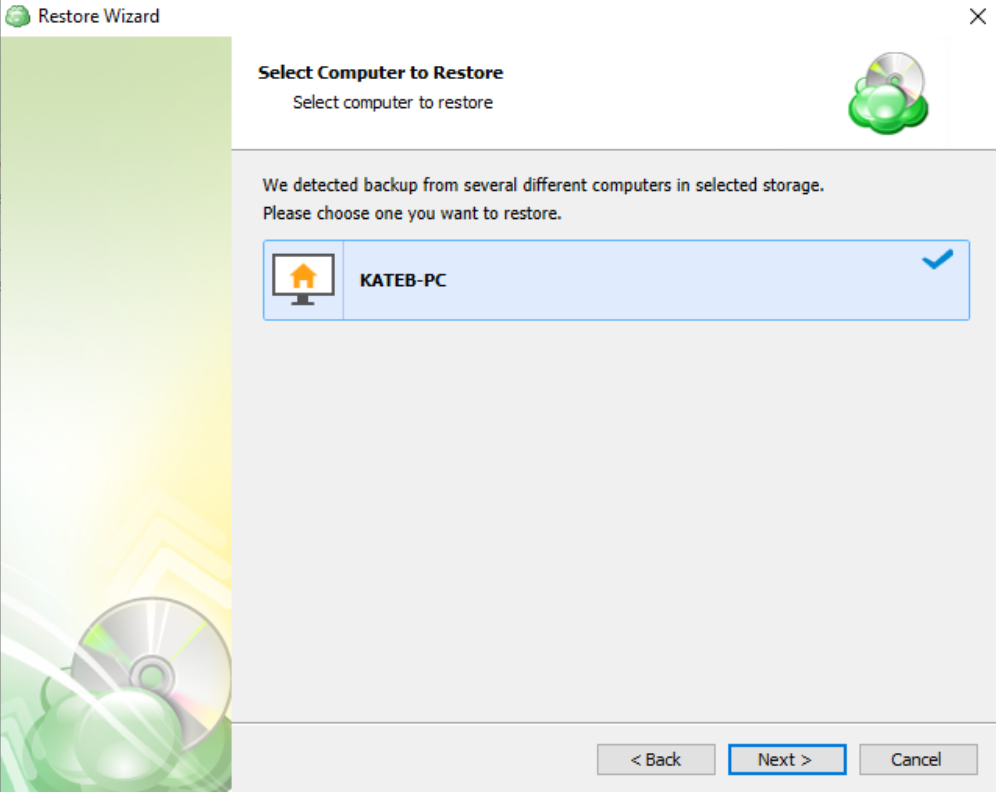 Selecciona el ordenador desde el cual realizar la restauración. Next.