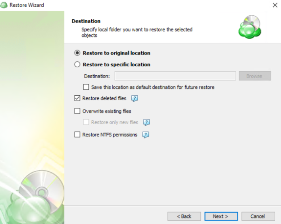 Restore NTFS permissions: Restaurará los permisos NTFS (si el backup incluía permisos).